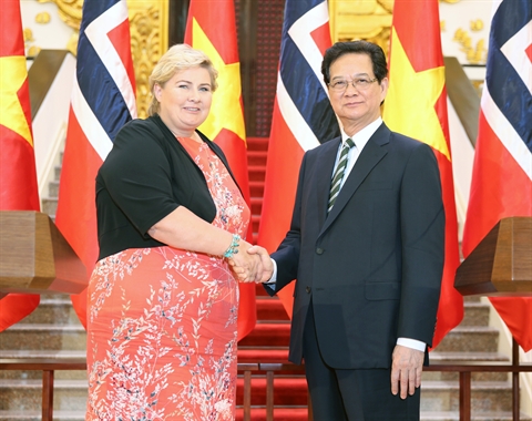 | La Première ministre norvégienne Erna Solberg et son homologue vietnamien Nguyên Tân Dung, lors de sa visite officielle de trois jours (du 16 au 18 avril) au Vietnam. |