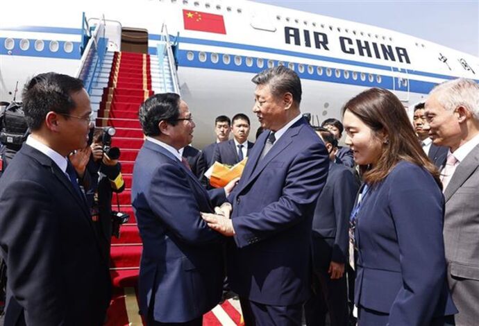 Le 14 avril à midi, le secrétaire général du Parti communiste chinois et président de la République populaire de Chine, Xi Jinping, est arrivé à Hanoï pour entamer sa visite d'État au Vietnam. Le président Luong Cuong et le membre permanent du Secrétariat du Comité central du PCV, Trân Câm Tu, ont accueilli Xi Jinping et la délégation chinoise de haut rang à l'aéroport international de Nôi Bài. À l'aéroport, la délégation a été accueillie par 200 artistes de la troupe de tambours, ainsi que par 54 jeunes femmes en costumes représentant des ethnies vietnamiennes. De nombreux Vietnamiens, des Chinois au Vietnam, ainsi que des fonctionnaires et employés de l'ambassade de Chine au Vietnam, ont brandi des drapeaux des deux pays et des banderoles exprimant l'amitié traditionnelle entre les deux pays, pour accueillir chaleureusement le dirigeant chinois et sa suite.