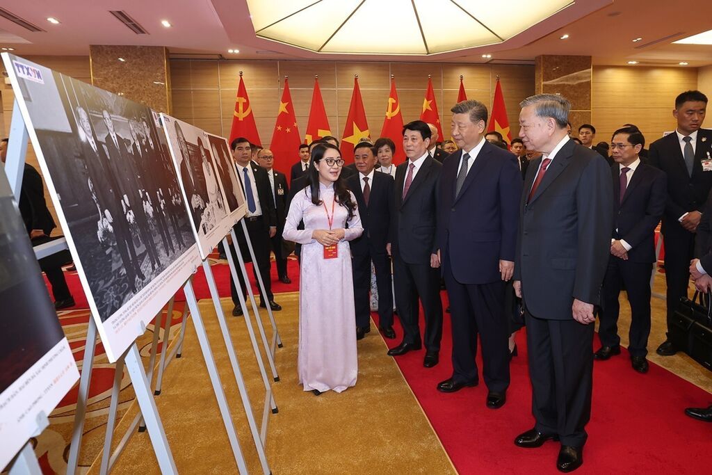 Le secrétaire général du Parti communiste du Vietnam (PCV), Tô Lâm, et le président Luong Cuong, ainsi que le secrétaire général du PCC et président chinois Xi Jinping, ont visité l'exposition photographique "75 ans de relations diplomatiques Vietnam - Chine", organisée conjointement par l'Agence Vietnamienne d’Information (VNA), l'Agence de presse Xinhua (Xinhua) et l'Union des organisations d'amitié du Vietnam (UIA). Tô Lâm a respectueusement offert à Xi Jinping un album photo de l'Agence vietnamienne d’Information, présentant des clichés représentatifs et impressionnants de ses cinq visites au Vietnam depuis 2011.
