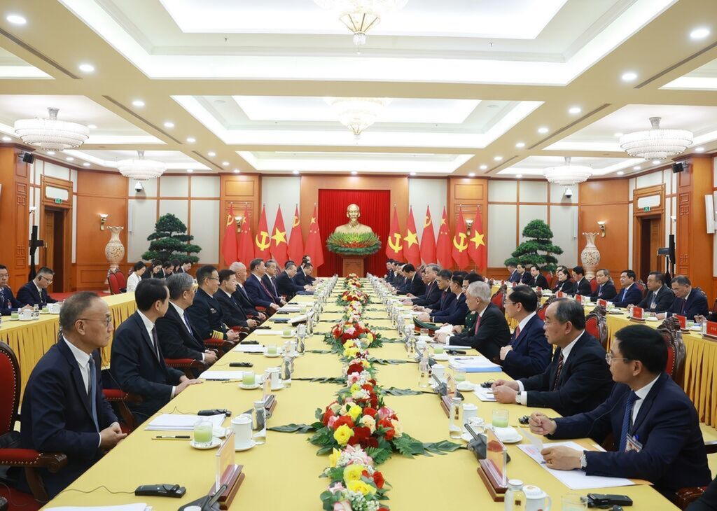Le secrétaire général du Parti, Tô Lâm, a présidé la cérémonie d'accueil officielle avec les plus hautes cérémonies réservées aux chefs d'État, notamment 21 salves de canon tirées depuis la citadelle impériale de Thang Long. Il a ensuite eu un entretien privé avec Xi Jinping au siège du Comité central du Parti. À l'issue de leurs entretiens, les deux dirigeants ont passé en revue et écouté une brève présentation des 45 accords de coopération dans de nombreux domaines signés entre les ministères, secteurs et localités des deux pays, témoignant ainsi des avancées considérables réalisées par les deux parties au cours de cette visite.