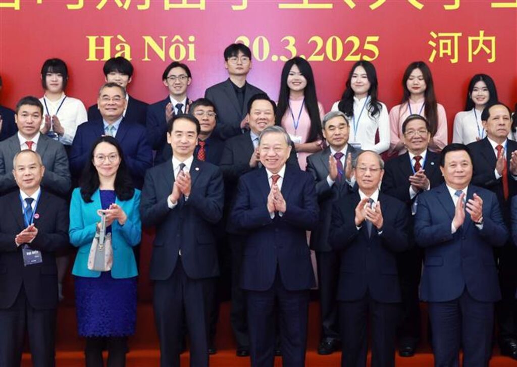 | Le secrétaire général du Parti, Tô Lâm (centre, premier rang), et des délégués participent à une réunion avec des étudiants vietnamiens et chinois de toutes les époques, le 20 mars. |