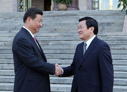 | Le président vietnamien Truong Tân Sang (droite) accueilli par son homologue chinois Xi Jinping, le 20 juin à Pékin. Photo : Nguyên Khang/VNA/CVN |