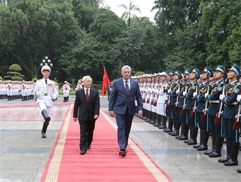 | Le secrétaire général du PCV et président vietnamien Nguyên Phu Trong (gauche) et le président du Conseil d'État et du Conseil des ministres de Cuba, Miguel Díaz-Canel Bermúdez, le 9 novembre à Hanoï. |