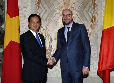 | Le Premier ministre vietnamien Nguyên Tân Dung (gauche) et son homologue belge, Charles Michel, le 2 décembre à Bruxelles (Belgique). |