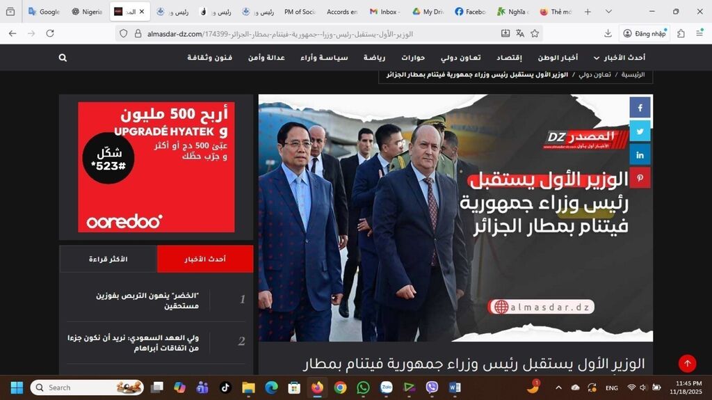 Le journal électronique Echoruk Online a également publié des articles et des photos indiquant que le Premier ministre Pham Minh Chinh était arrivé en Algérie le 18 novembre, débutant ainsi sa visite officielle du 18 au 20 novembre.