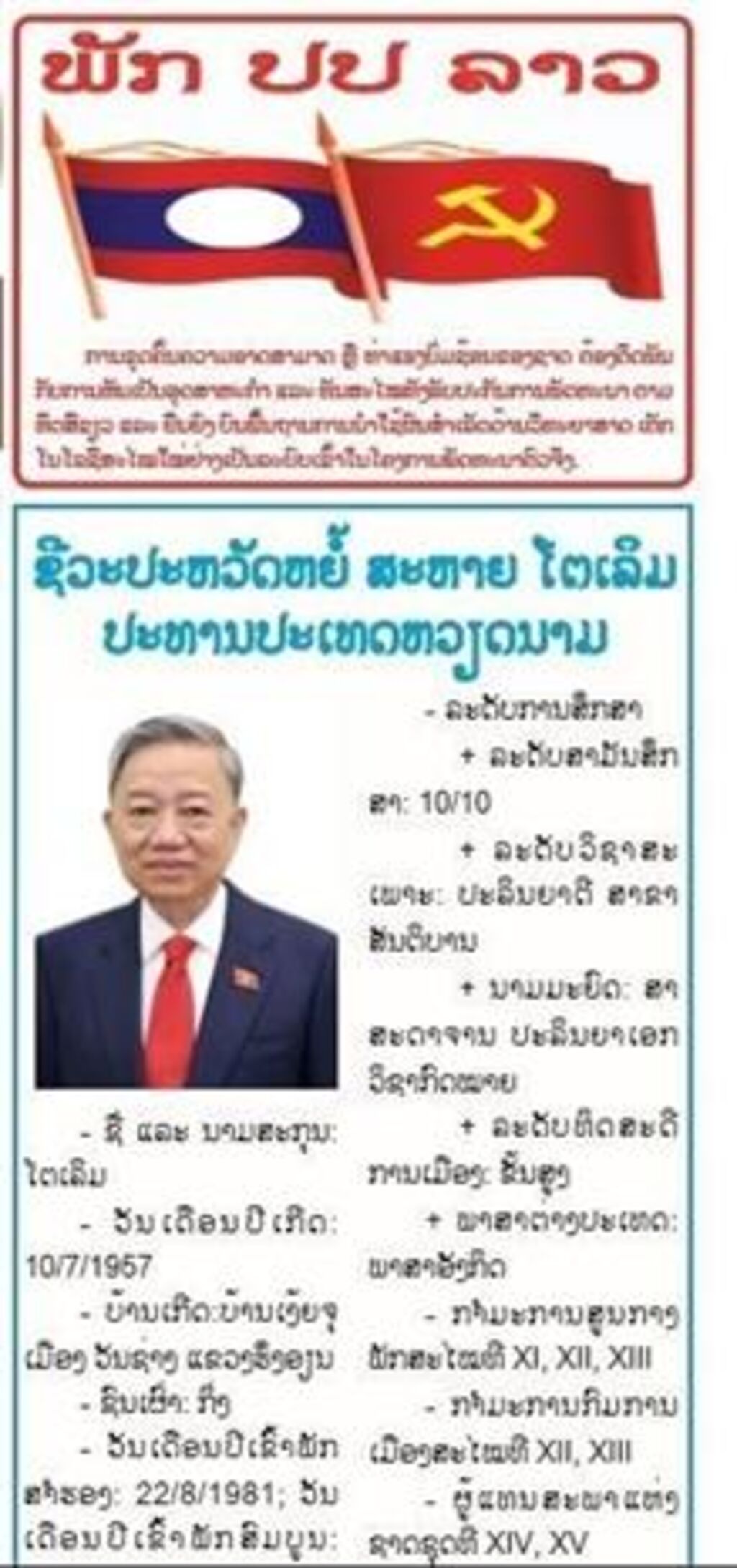 L'article passe également en revue le contexte de la visite du président Tô Lâm au Laos, qui a eu lieu alors que la grande amitié, la solidarité particulière et la coopération intégrale entre le Laos et le Vietnam continuaient à se développer de plus en plus profondément et pus efficacement. Les relations politiques Laos-Vietnam continuent de gagner en confiance, en proximité et en stabilité et deviennent de plus en plus étroites et fraternelles.