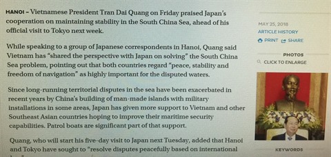 | Un article au sujet de la visite du président vietnamien au Japon, publié le 25 mai sur Japan Times. |