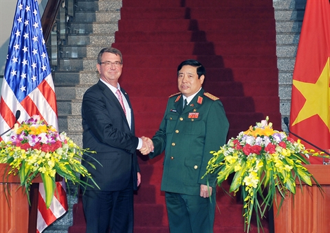 | Le ministre vietnamien de la Défense, Phùng Quang Thanh (droite), et le secrétaire américain à la Défense, Ashton Carter, le 1er juin à Hanoi. |