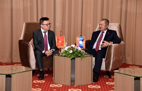 | Le directeur général adjoint de la VNA, Lê Quôc Minh (gauche), et le ministre laotien de l'Information, de la Culture et du Tourisme, Kikeo Khaykhamphithoune, le 8 décembre à Vientiane. |