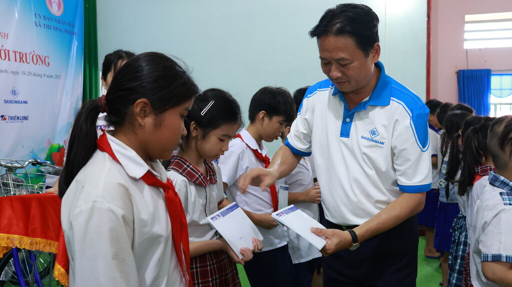 | Le représentant de SaigonBank a remis des bourses aux élèves défavorisés. |