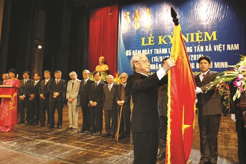 | Le 15 septembre 2010, le président de l’Assemblée nationale Nguyên Phu Trong décernant l’Ordre Hô Chi Minh (pour la 2e fois) à la VNA à l’occasion de son 65e anniversaire. |