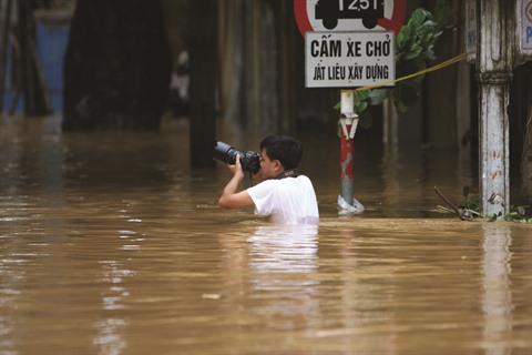 | Le journaliste Xuân Truong en mission lors des crues de septembre 2009 à Hanoï. |