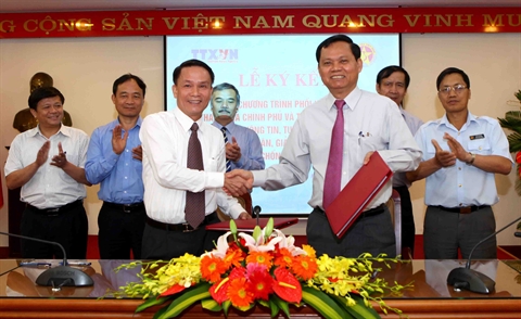 | Le directeur général de la VNA Nguyên Duc Loi (gauche) et l'inspecteur général du gouvernement Huynh Phong Tranh lors de la cérémonie de signature, le 10 juin à Hanoi. |