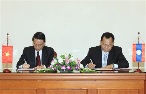 | Signature du procès-verbal de l'entretien entre le directeur général de la VNA, Nguyên Duc Loi (gauche) et son homologue lao de la KPL, Sounthone Khanthavong |