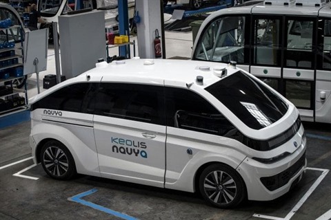 | Le premier robot-taxi au monde, l'+Autonom Cab+, attendu dans les rues de Lyon en fin d'année, photographié le 23 avril dans l'usine de son fabricant Navya, près de Lyon. |