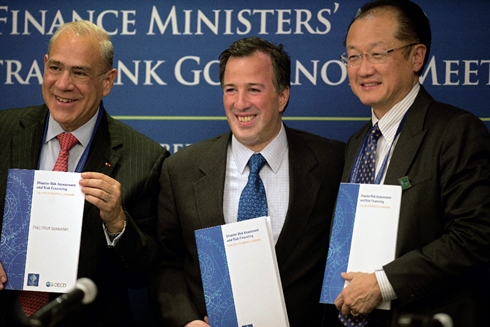 | Le secrétaire général de l'OCDE, Jose Angel Gurria (gauche), le ministre mexicain des Finances, José Antonio Meade (centre), le président de la Banque mondiale Kim Yong Jim, le 4 novembre à Mexico. |
