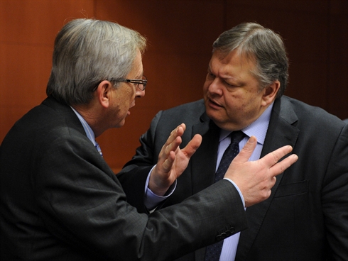 | Le président de l'Eurogroupe, Jean-Claude Juncker (gauche) et le ministre grec des Finances, Evangelos Venizelos, le 9 février à Bruxelles. |