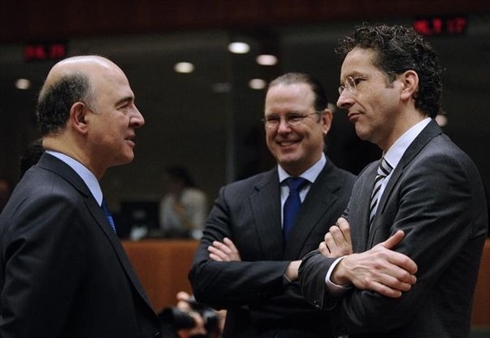 | Les ministres de Finances français Pierre Moscovici, Suédois Anders Borg et hollandais Jeroen Dijsselbloem le 12 février 2013 à Bruxelles. |