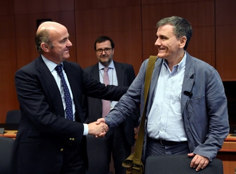 | Le ministre grec de l'Économie, Euclid Tsakalotos (droite), et son homologue espagnol Cristobal Montoro Romero, le 24 mai à Bruxelles. |