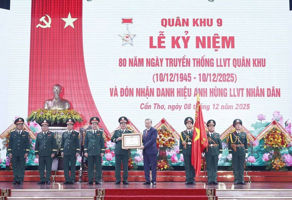 À cette occasion, au nom des dirigeants du Parti, de l’État et de la Commission militaire centrale, le secrétaire général Tô Lâm a remis le titre de "Héros des Forces armées populaires" à la force armée de la Zone militaire 9, en reconnaissance de ses grandes contributions à la cause révolutionnaire du Parti, de l’État et du peuple.