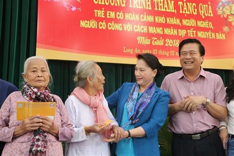 | Nguyên Thi Kim Ngân (2e à droite), présidente de l'Assemblée nationale, offre des cadeaux du Nouvel An à des bénéficiaires de politiques sociales, enfants défavorisés et pauvres à Long An. |