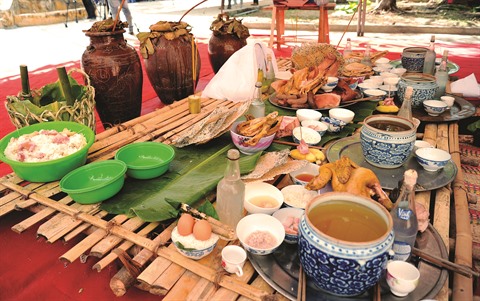 | Alcool, riz, viande de porc et de poulet constituent le plateau d’offrandes. |
