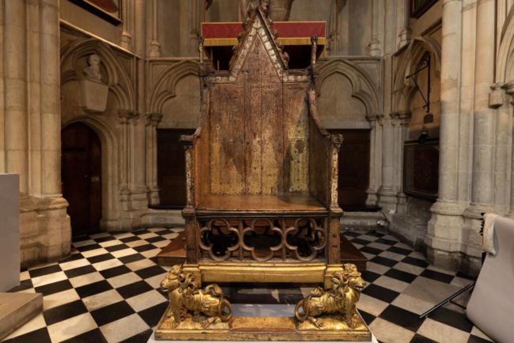 | La chaise du roi Edouard à l'Abbaye de Westminster, le 12 avril 2023 à Londres. |