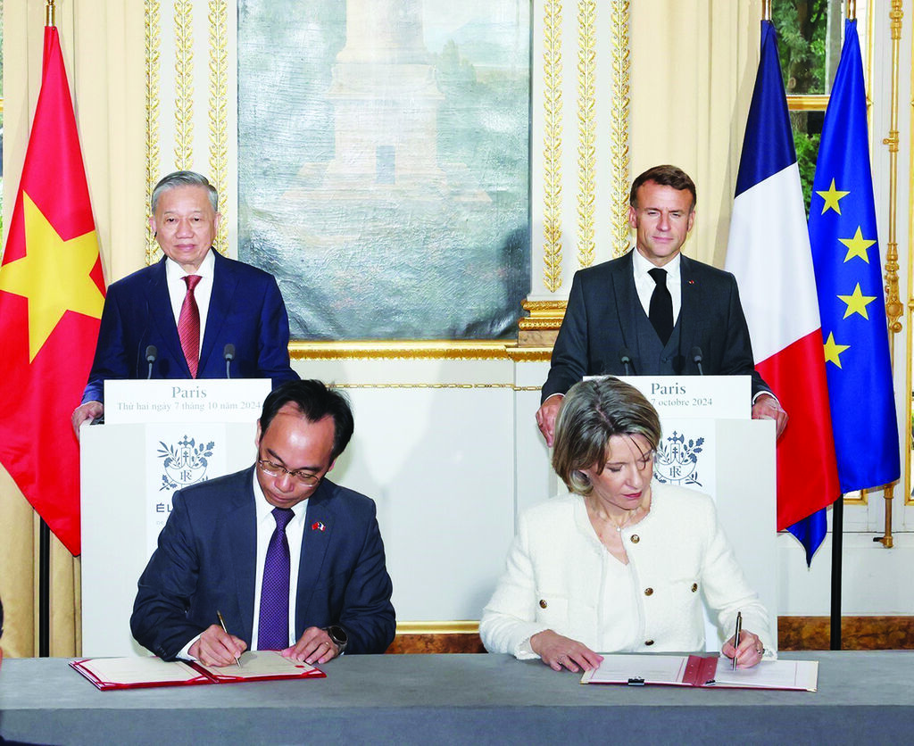 | Le secrétaire général du Parti communiste du Vietnam et président de la République, Tô Lâm (gauche), et le président français Emmanuel Macron témoignent de la signature de l’Accord de coopération éducative entre les deux gouvernements, le 7 octobre 2024 à Paris (France). |