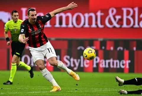 | L'attaquant suédois de l'AC Milan, Zlatan Ibrahimovic, tire lors du match de Serie A face à l'Atalanta Bergame, à Milan, le 23 janvier 2021. |