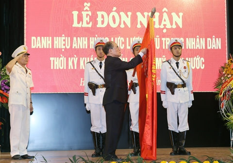 | Nguyên Sinh Hùng remet le 29 juin à Hanoi le titre «Héros des forces armées populaires de la guerre de résistance anti-américaine» à l’Académie de la sécurité populaire. |