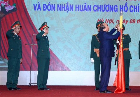 | Le Premier ministre Nguyên Xuân Phuc attache l’Ordre Hô Chi Minh sur le drapeau traditionnel de l'Académie de médecine militaire du Vietnam. Photo: Thông Nhât/VNA/CVN |