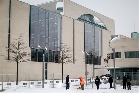 | La patrouille de police à l'extérieur de la chancellerie allemande à Berlin, après la découverte d'un colis suspect, le 6 janvier. |
