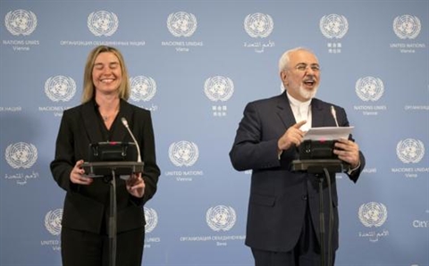 | Le ministre iranien des Affaires étrangères Mohammad Javad Zarif et la cheffe de la diplomatie européenne Federica Mogherini, à Vienne le 16 janvier. |