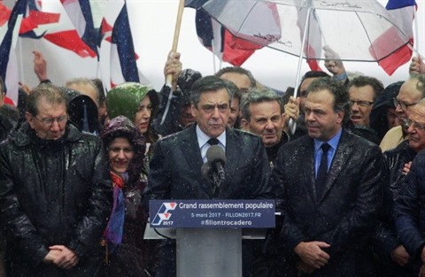 Sur la place Trocadéro proche de la Tour Eiffel, où des dizaines de milliers de fidèles avaient convergé, drapeau tricolore à la main, le candidat de la droite a semblé s'accrocher, malgré les défections et appels au retrait en cascade sous l'impact de l'affaire des emplois présumés fictifs de sa femme Penelope et de deux de ses enfants.