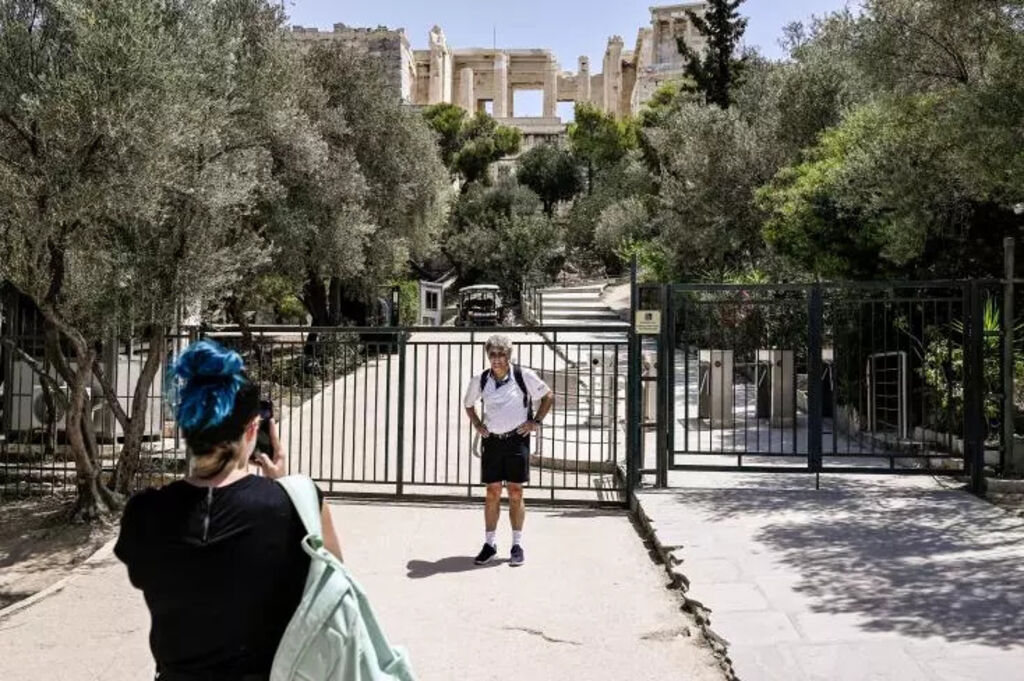 | Un touriste se fait photographier devant le site de l'acropole fermé au public en raison de la canicule à Athènes, le 14 juillet 2023. |