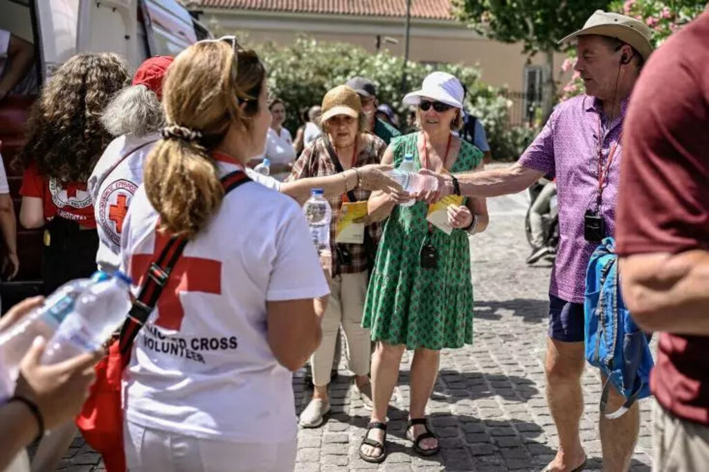 La Croix-Rouge s'est déployée jeudi 13 juillet au pied de l'Acropole pour distribuer des bouteilles d'eau et venir en aide aux touristes qui pourraient être victimes d'insolation ou d'évanouissements.