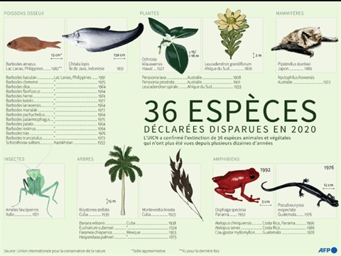 | L'Union internationale pour la conservation de la nature (UICN) a confirmé l'extinction de 36 espèces animales et végétales en 2020, plus vues depuis des dizaines d'années. |