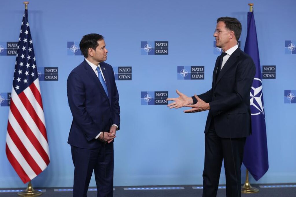 | Le secrétaire général de l'Organisation du traité de l'Atlantique Nord (OTAN), Mark Rutte (droite), et le secrétaire d'État américain, Marco Rubio, s'adressent à la presse lors d'une réunion des ministres des Affaires étrangères de l'OTAN au siège de l'OTAN à Bruxelles (Belgique), le 3 avril 2025. |