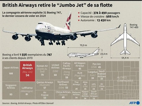 Le dernier 747 devait être retiré de la flotte "en 2024", a précisé BA, rappelant que la fin du gros porteur était déjà programmée. Lancé en 1970 par le constructeur américain Boeing, le "Jumbo Jet" a révolutionné le marché du transport aérien et est devenu dans les décennies qui ont suivi un appareil mythique pouvant transporter 400 passagers à son bord.