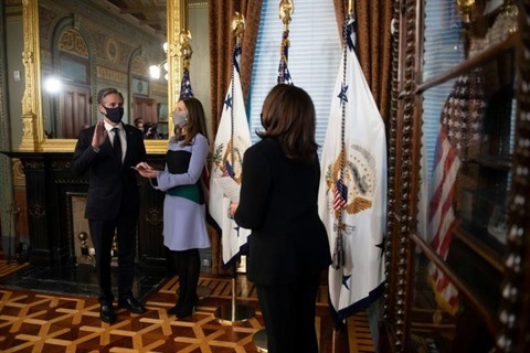 | Antony Blinken prête serment comme secrétaire d'É tat devant la vice-présidente américaine Kamala Harris le 27 janvier 2021. |