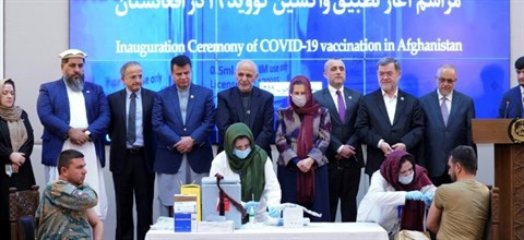 | Un membre des forces de sécurité en Afghanistan reçoit une dose de vaccin anti-COVID lors de la cérémonie de lancement de la campagne de vaccination au palais présidentiel, le 23 février. |