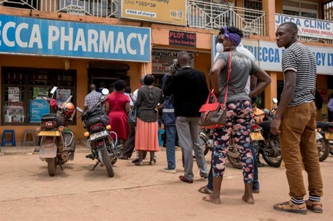 | Longue queue devant une pharmacie à Kampala, le 26 mars. |