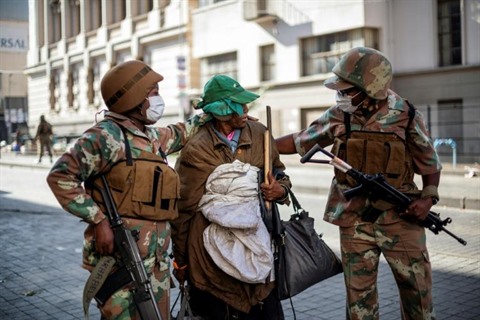 | Des membres des forces de défense escortent un sans-abri à Johannesburg vers un centre de rassemblement, le 27 mars. |
