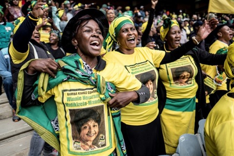 | Des militantes chantent et dansent en hommage à Winnie Mandela, le 11 avril au stade Orlando de Soweto. |