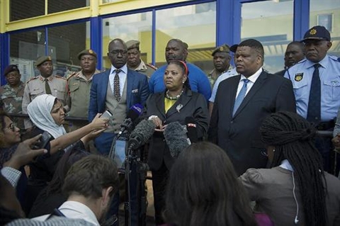 | La ministre de la Défense, Nosiviwe Mapisa-Nqakula, lors d'un point presse, le 21 avril. |