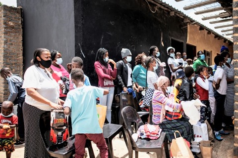 | Distribution d'aide alimentaire en décembre 2020 à Thembisa, en Afrique du Sud. |