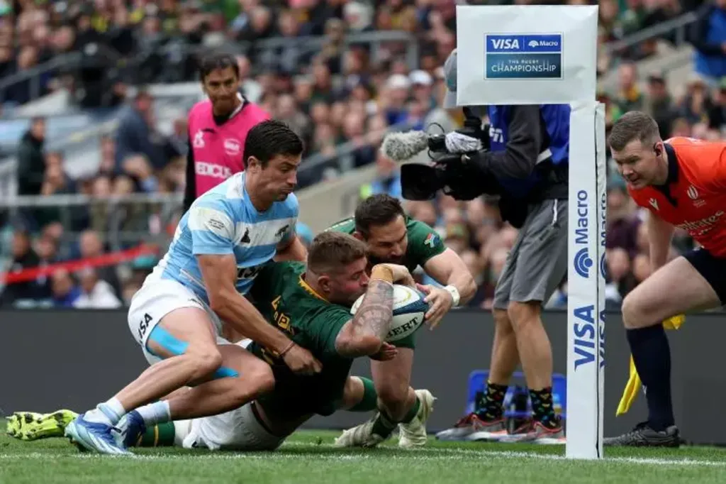 Dans un Twickenham bien garni et plutôt acquis aux Springboks, les Argentins ont marqué le premier essai après un numéro de Bautista Delguy, en feu tout comme l'arrière de Toulouse Juan-Cruz Mallia. Grâce à plusieurs actions tout en vitesse, ils ont mené de dix points une bonne partie de la première période (13-3).