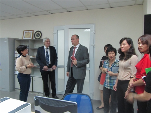 | Le directeur régional de l'AUF, Olivier Garro (2e, gauche), et la rédactrice en chef du Courrier du Vietnam, Nguyên Thu Hà (2e, droite), lors de la séance de travail le 17 avril à Hanoi. |