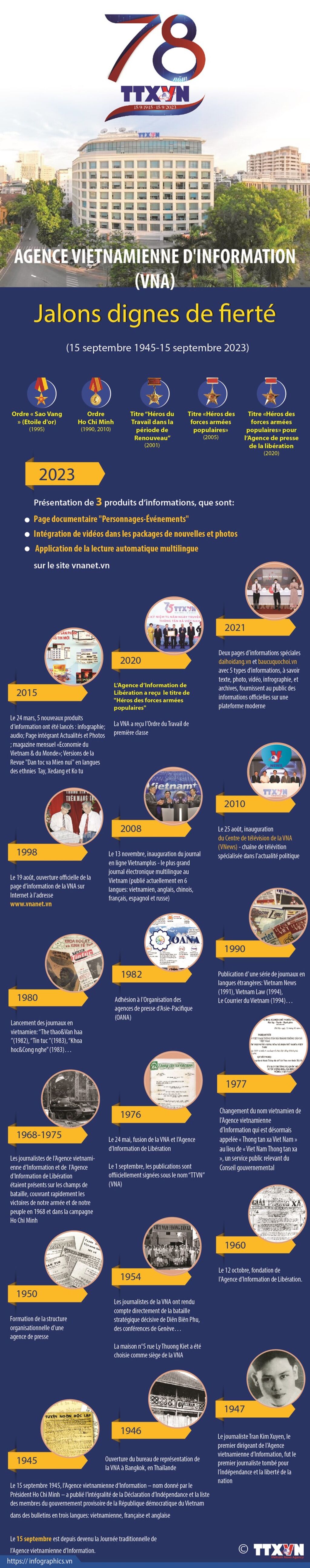 Durant 78 ans, aux côtés du pays et sous la direction directe du Parti et de l’État, la VNA n’a cessé de se développer. Dans la période d'industrialisation, de modernisation et d'intégration internationale, la VNA s'efforce d'atteindre son objectif de devenir une agence de presse réputée au niveau régional en suivant le modèle d'un complexe médiatique fort, moderne entretenant des services d’information, contribuant à répondre aux exigences et aux tâches définies.