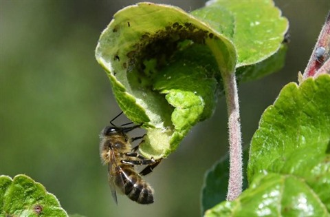 | Une abeille sur une feuille de pommier couverte de pucerons, au Centre d'agroforesterie de l'INRA, le 16 mai 2019 à Restinclières, près de Montpellier. |